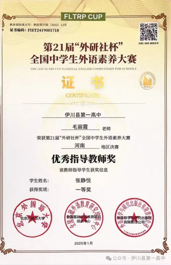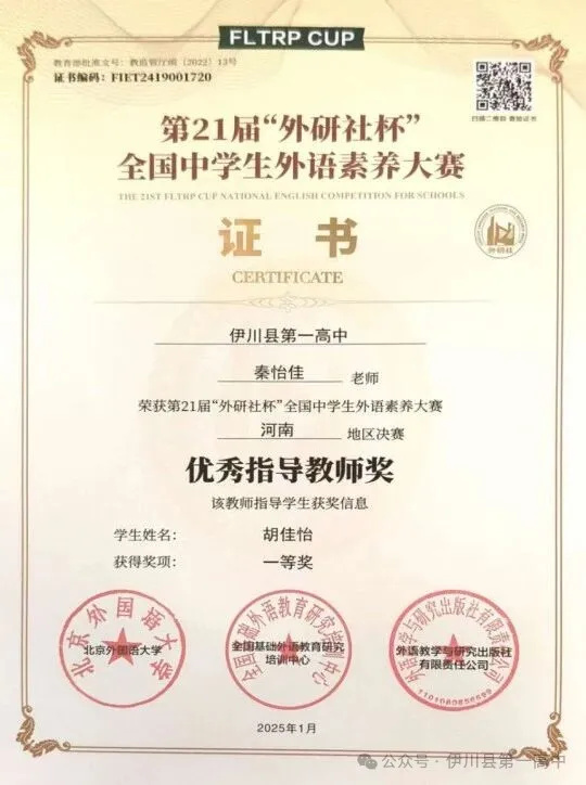 春风化雨育桃李,文以载道谱华章。在第21届“外研社杯”全国中学生外语素养大赛的荣誉殿堂里,伊川县第一高中凭借深耕英语教育的执着与担当,荣获“优秀组织单位”奖荣誉称号!